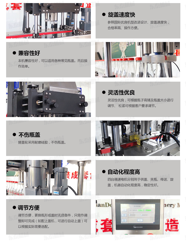 全自動旋蓋機(jī)是參照國機(jī)型改進(jìn)設(shè)計(jì)、旋蓋速度快,合格率高、操作方便。可適用于食品、制藥、日化、農(nóng)藥、化妝品等行業(yè)的不同瓶形的旋蓋。四臺調(diào)速電機(jī)分別用于供蓋、夾瓶、傳送、旋蓋,機(jī)器自動化程度高