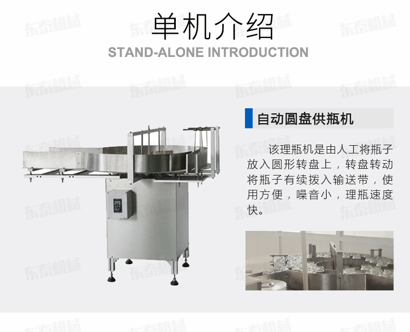 該理瓶機(jī)是由人工將瓶子放入圓形轉(zhuǎn)盤上,轉(zhuǎn)盤轉(zhuǎn)動(dòng)將瓶子有續(xù)撥入輸送帶,進(jìn)入灌裝機(jī)進(jìn)行灌裝。使用方便,噪音小,理瓶速度快,操作簡單是不可缺少的一個(gè)環(huán)節(jié)。