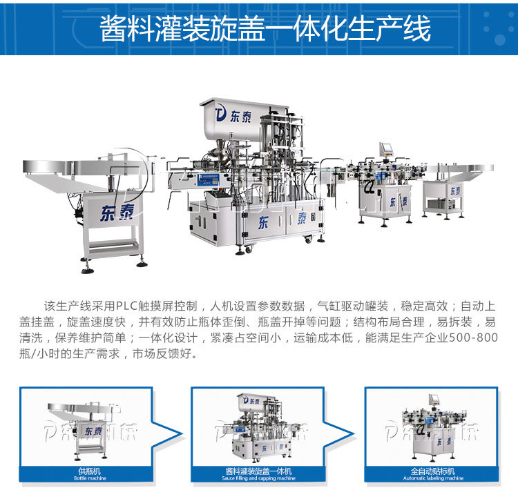 作為國內(nèi)專業(yè)的醬料灌裝機(jī)廠家,我們東泰機(jī)械能夠在市場中不斷實(shí)現(xiàn)創(chuàng)新和突破,是我們結(jié)合了市場的真實(shí)情況以及客戶的真實(shí)需求來不斷跟隨市場的需求和需要進(jìn)行變化,從而掌握市場的主動權(quán),才致使醬料灌裝機(jī)朝著高端化、智能化的方向前行,來得到更多消費(fèi)者的好評和認(rèn)可,辣椒醬再我們生活之中已經(jīng)是屬于再熟悉不過的產(chǎn)品了,雖說醬料的好處比較多,也可以提高食物的口味,但是你可能不知道的是,味道好的醬料也是離不開包裝,既然有了包裝的需求自然離不開醬料灌裝機(jī)。